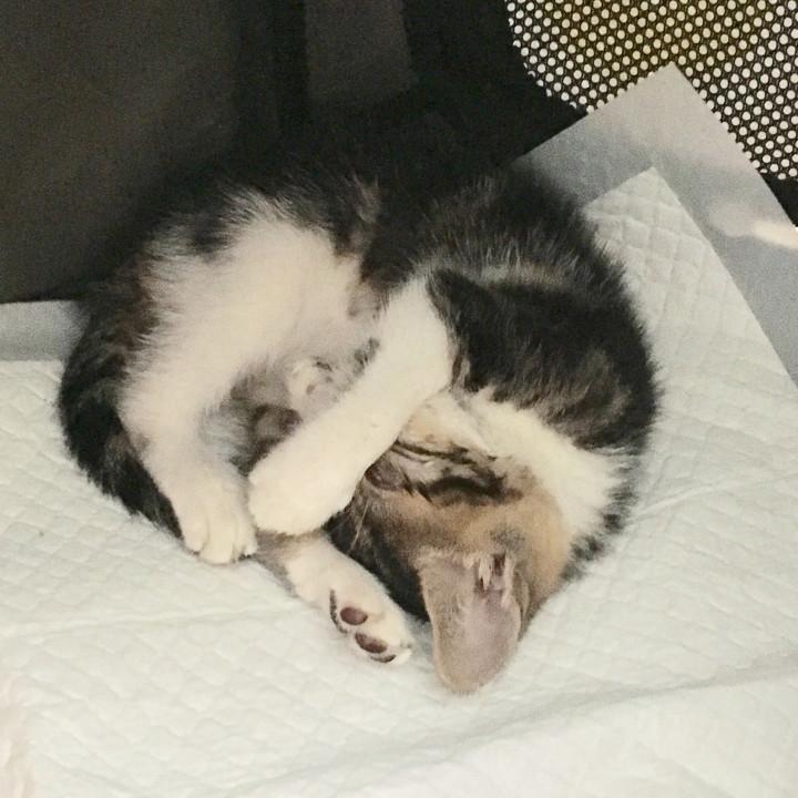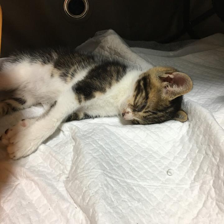 この子は、おもちちゃんの兄弟。男の子で、4日後に同じ場所で保護しました。まだ、目の炎症があって、点眼してます。治るといいね。