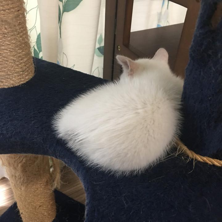 おもちちゃんの寝姿は、ふわっふわっで丸い。うちに来て1週間、お気に入りの場所が出来たらしい(^^)一方、くろまめ君は・・