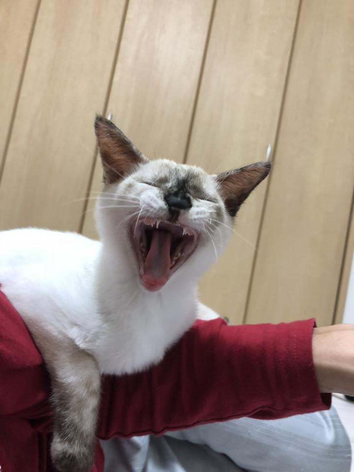 と飼い主の腕にしがみつき徹底抗戦の構えを見せています