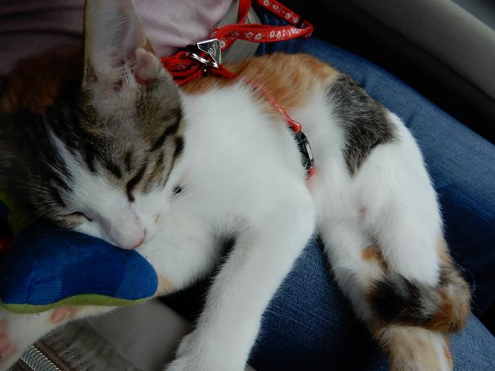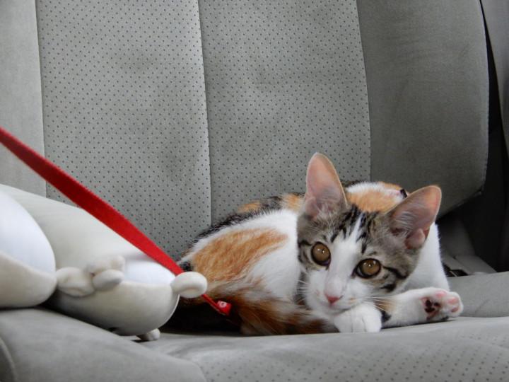移動中はキャリーで寝てるか遊んでるかですが、休憩中は座席でくつろぐようになりました