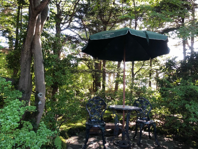 お庭があって、水出し珈琲のクルクルしたガラスの器具があって。