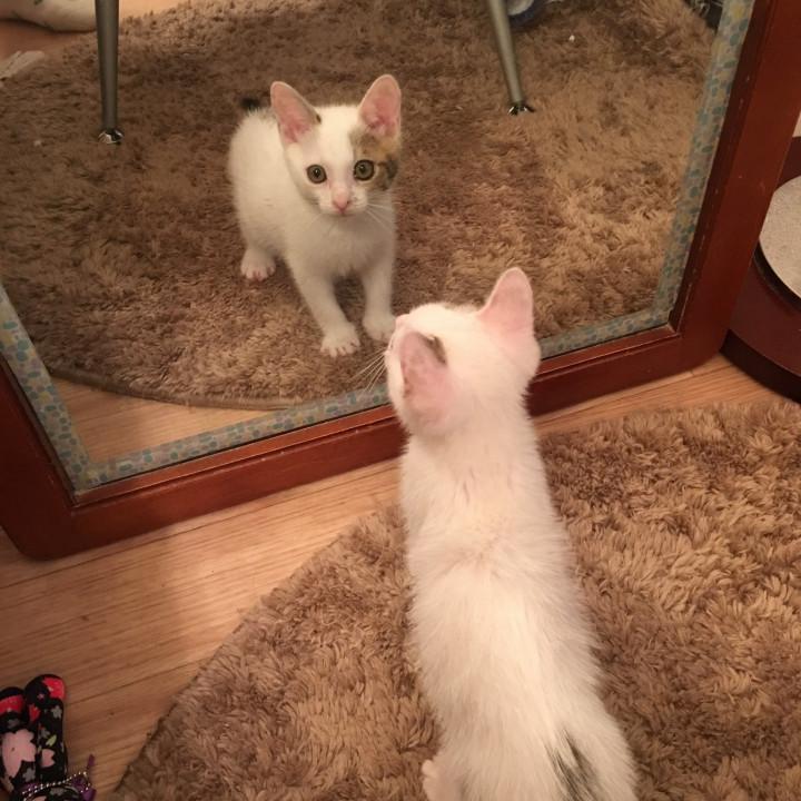 初めて、おもちは自分を見た。う〜ん、これは、誰だ??くろまめじゃない。この家の、大っきな子でもない。おもち、悩んじゃった。鏡の後ろに行ったら、いなくなった・・。鏡の前に、またいる。ん?鏡の中に、おもち・・これ、あたし?おもちは、しばらく、鏡の中のおもちに、ハイタッチしたりして、悩んでた。