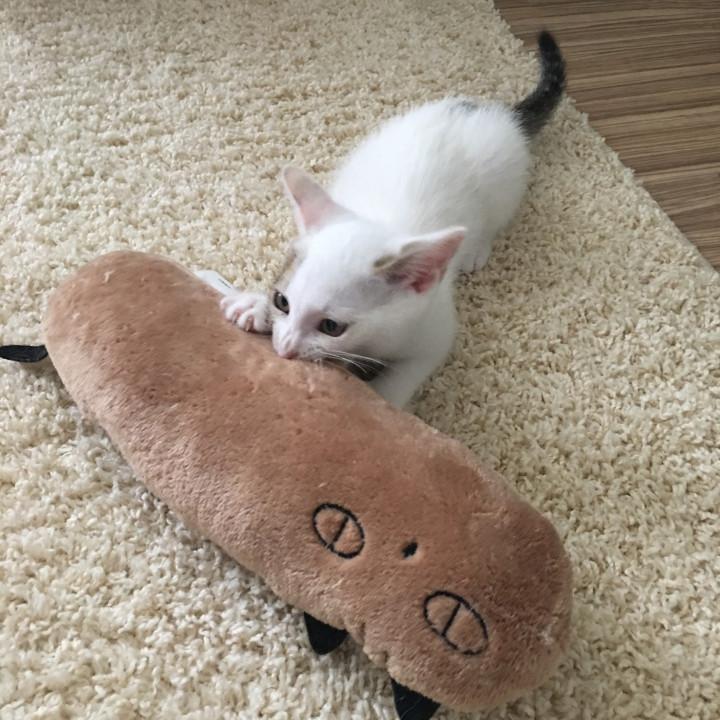おもち、この蹴りぐるみを、どうしても、ベッドに、持って行きたいらしい。でも、自分よりも大きいから、なかなか、運べない。また、悩んでるみたい。