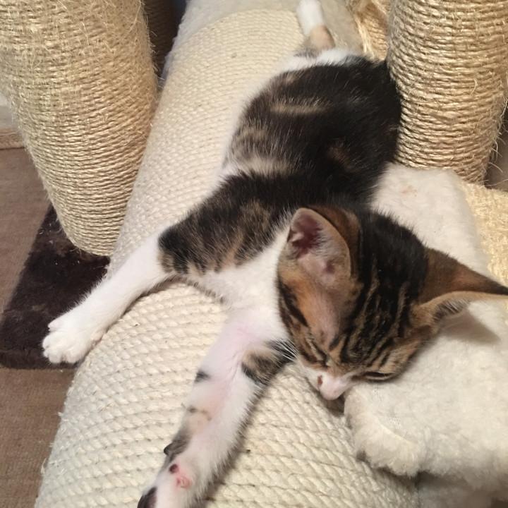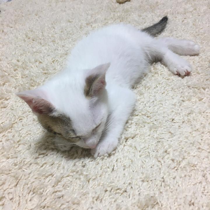 疲れたのかな、まだ、おもちには、難しいね、もう少し、大きくなったら、出来ると思うよ(^^;;今よりも、色んなことが沢山出来ると思うよ。おもちもくろまめも、まだ、小さいから、遊び疲れると、どこでも、寝ちゃうね。さっきまで、キャットタワーで遊んでたかと思ったら、ほら、くろまめ、寝ちゃったみたい(^^;;