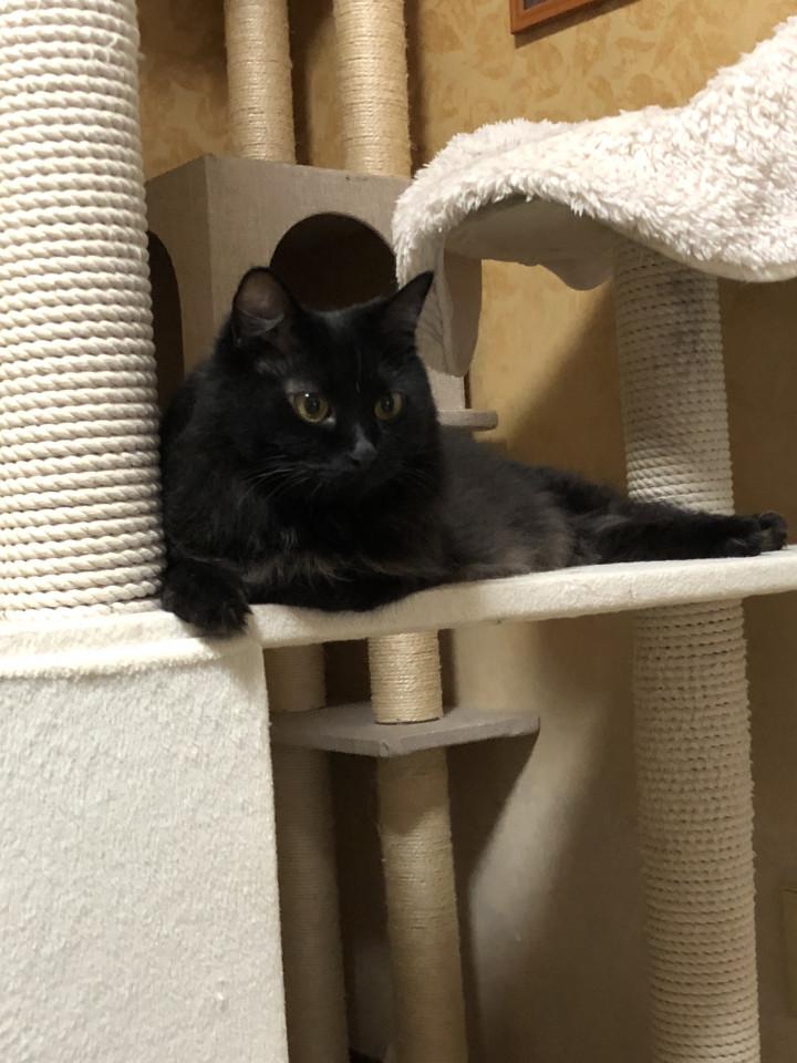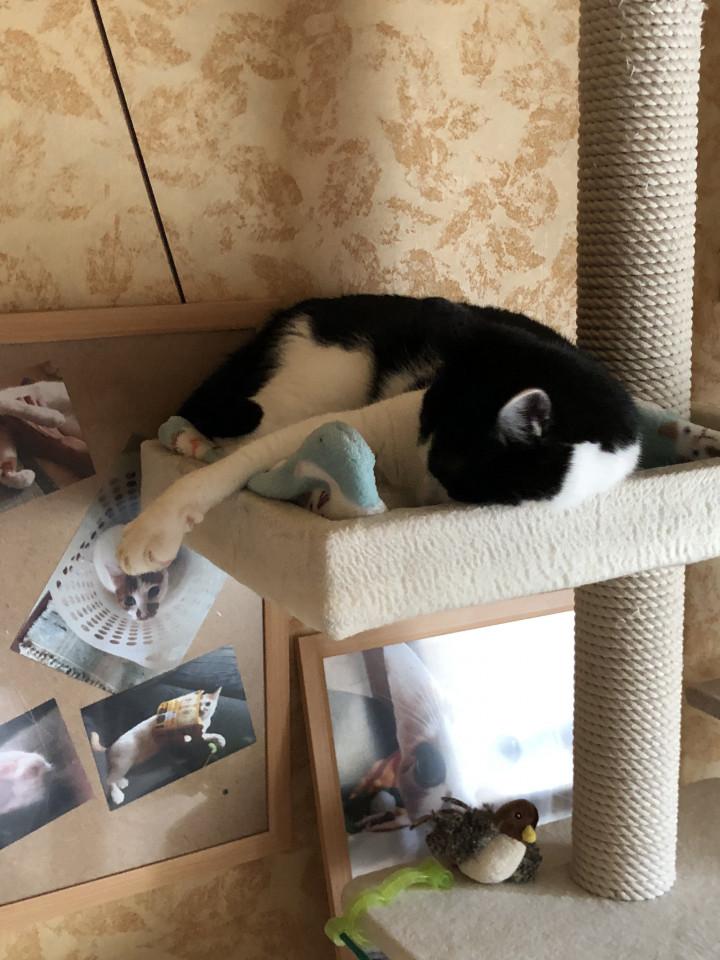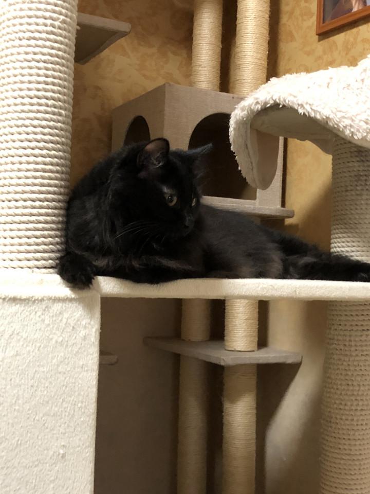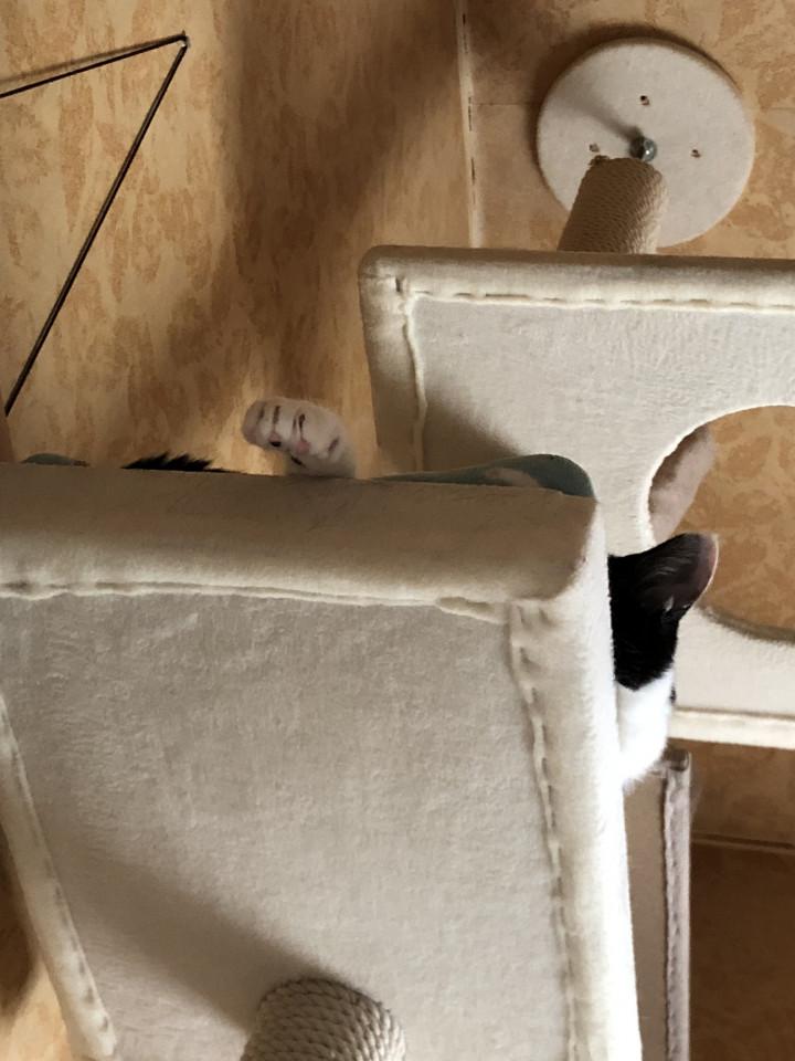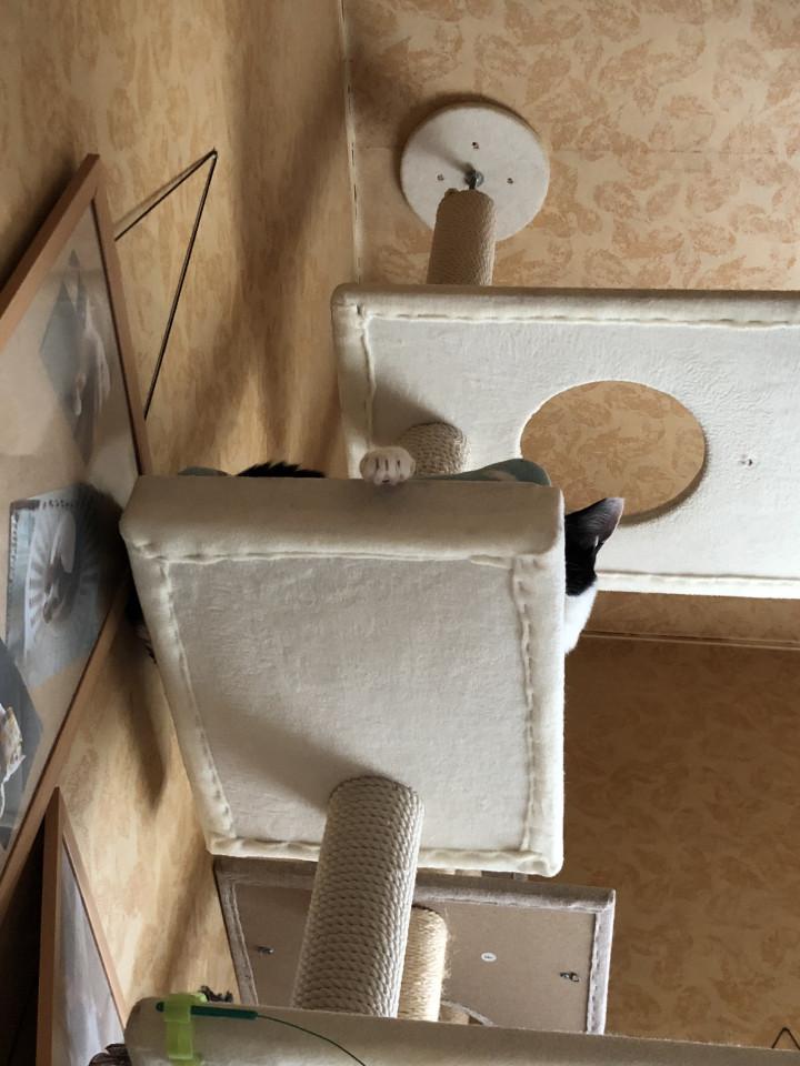 台風から急に涼しくなったので、のんちゃんはキャットタワーで寝る事が増えました。