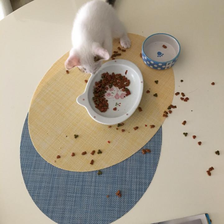 あー!おもち、ご飯で遊んじゃ、ダメ!おもちは、カリカリをお皿から、出して遊ぶ。食べる訳でもなく、器用に手ですくっては、外に出す。やめて〜(^^;;