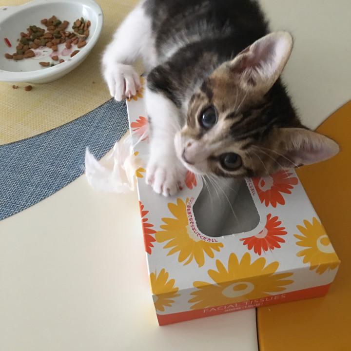 あー、くろまめ、ティッシュ出さないでー!とうとう、始まった(^^;;仔猫が必ず通る道。