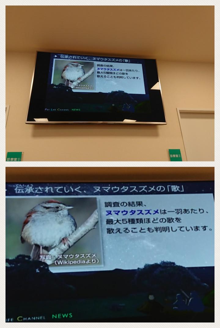 待合室のテレビに ヌマウタスズメが紹介されてました!