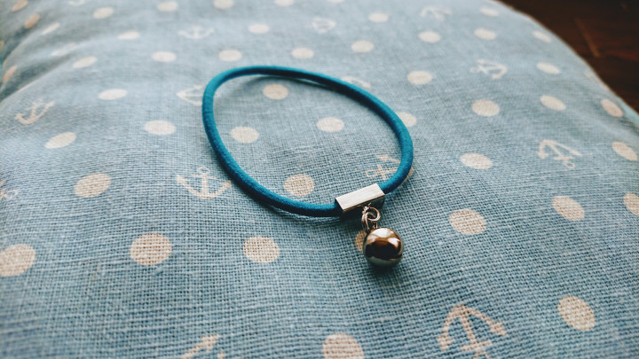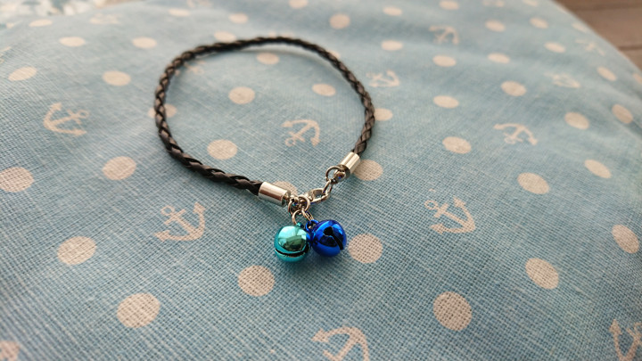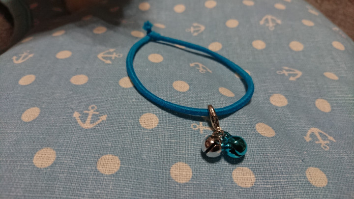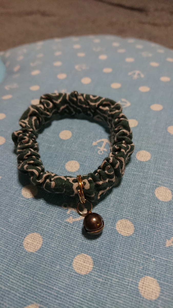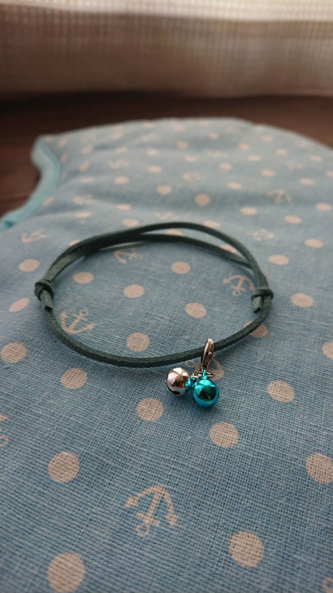 手芸コーナーにあった合成皮のブレスレットの金具を改造し、鈴を着けてみました。ですがこれは長さが調整出来ないのと、丈夫だけど、万が一引っ掛けても抜けず、安全性に欠けるなと思いボツ。