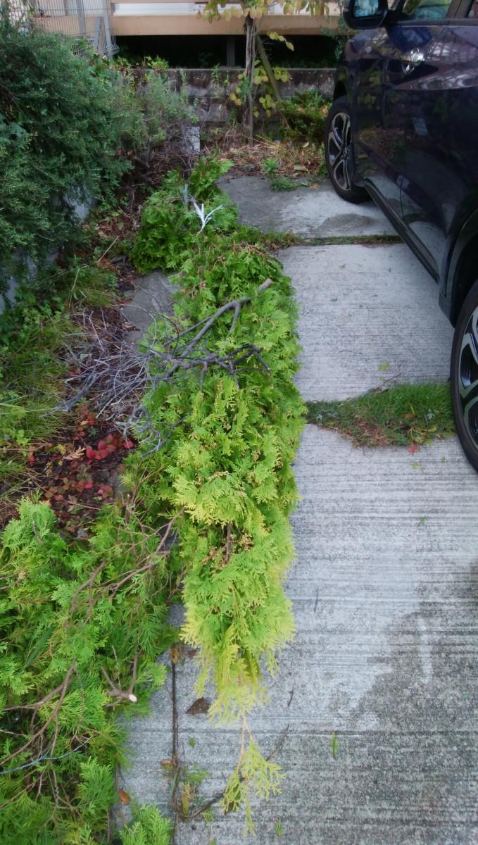 ひゃ~!この画像が送られてきたのが夜11時ころ。とりあえず、ヒモでフェンスにくくりつけ、通行する人や車の邪魔にならないように、、、、