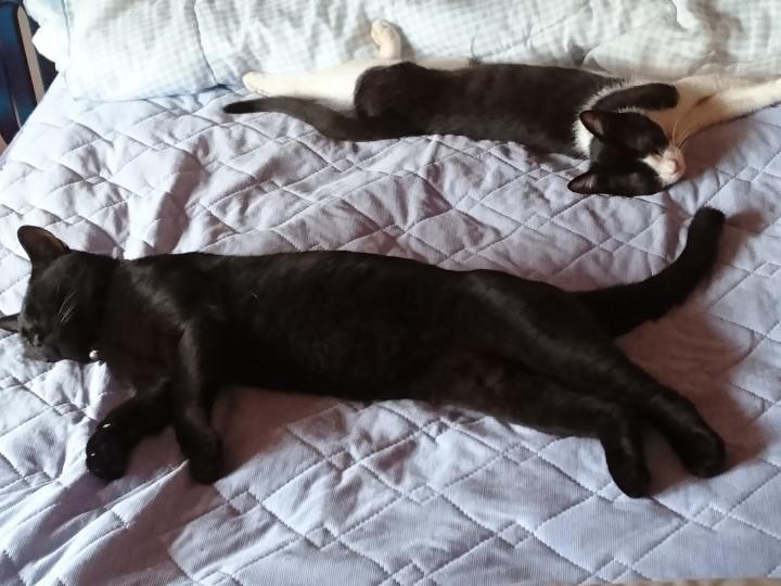 今年の夏は、暑すぎて流行りのクールなシーツで爆睡中の風と黒猫ヤマト君です。