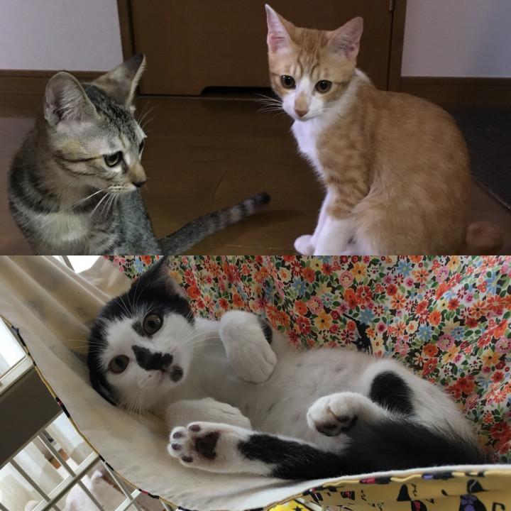 まい(茶白)、みぃ(キジ)、むぅた(ハチワレ)
