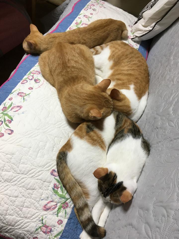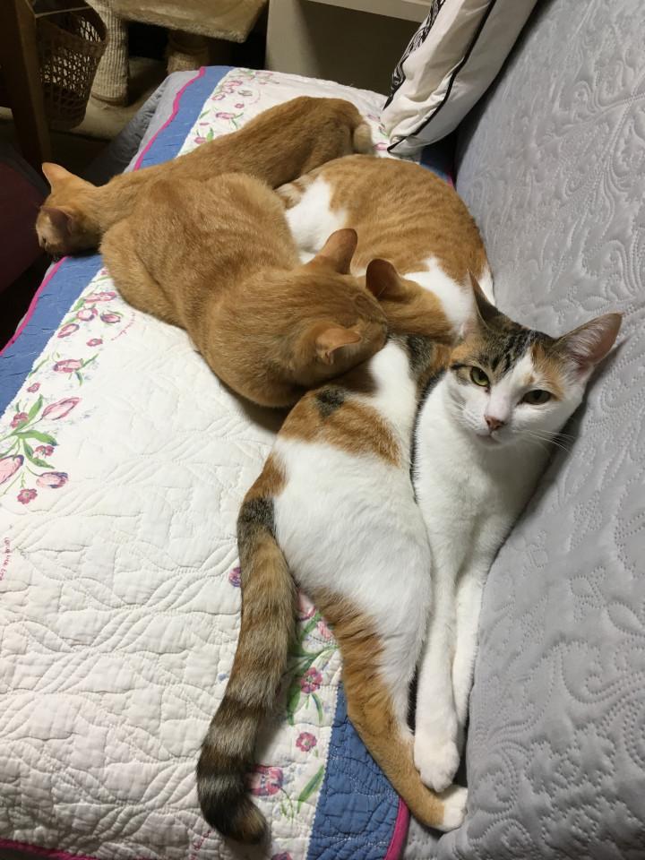 二階に保護した、家族猫4匹は、何時も、誰かとくっついて、