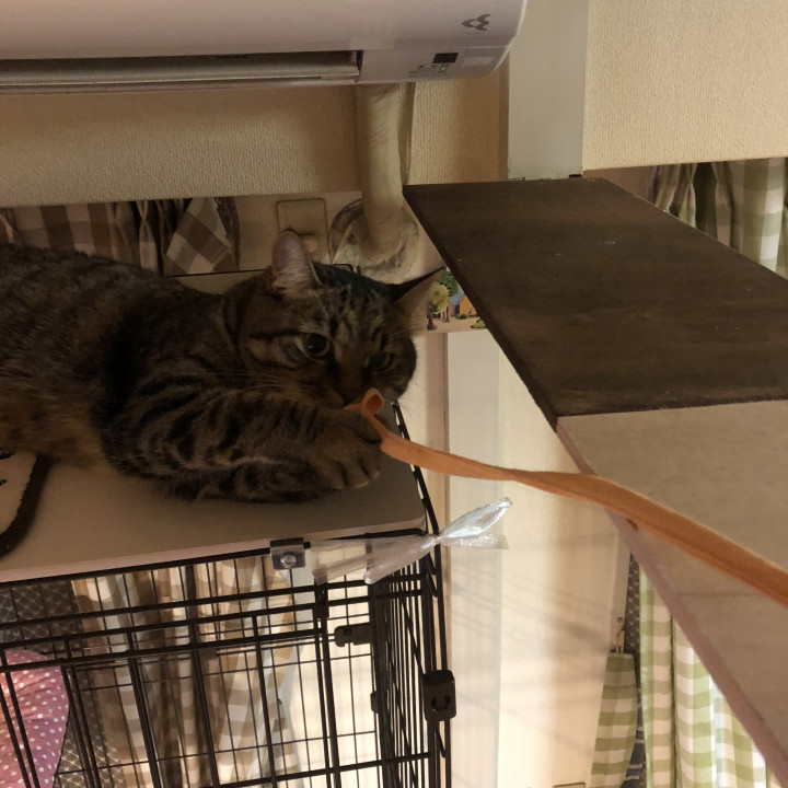 が、ケージのてっぺんでくつろいでしまい、なかなか歩いてくれそうになかったので、