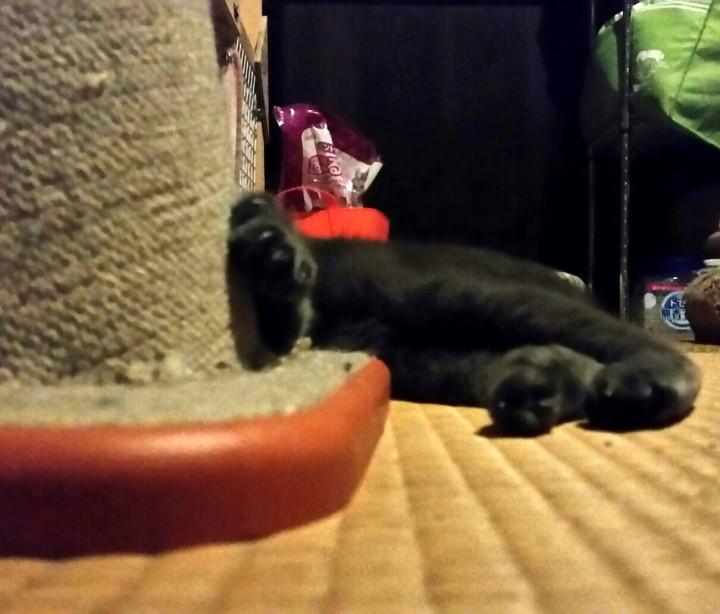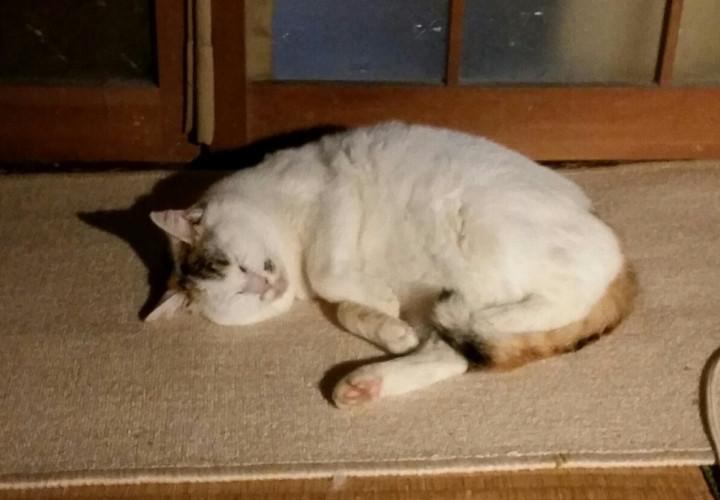 ひばりさんはこちらの縁側のカーテンの内側でいつものように眠いにゃ~んでした。