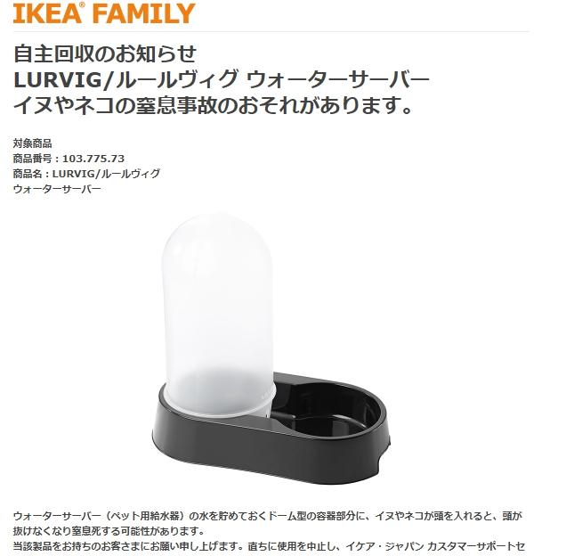 ウォーターサーバー(ペット用給水器)の水を貯めておくドーム型の容器部分に、イヌやネコが頭を入れると、頭が抜けなくなり窒息死する可能性があります。当該製品をお持ちのお客さまにお願い申し上げます。直ちに使用を中止し、イケア・ジャパン カスタマーサポートセンターにご連絡ください。商品代金を全額返金いたします。購入時のレシートは必要ありません。