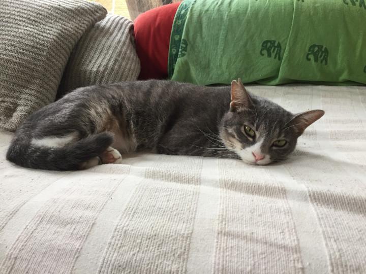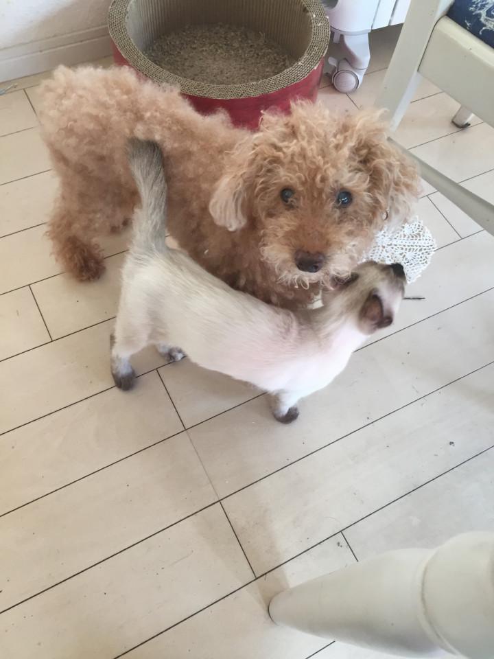現在もうすぐ1歳になるエマちゃんと、トイプードルの老犬15歳二匹とも大人しく仲良しです。8月にハチとロクを迎えまして、朝方運動会を毎日しております。 エマちゃんが、猫語で、何やらニャ〜ニャ〜ウニャ...