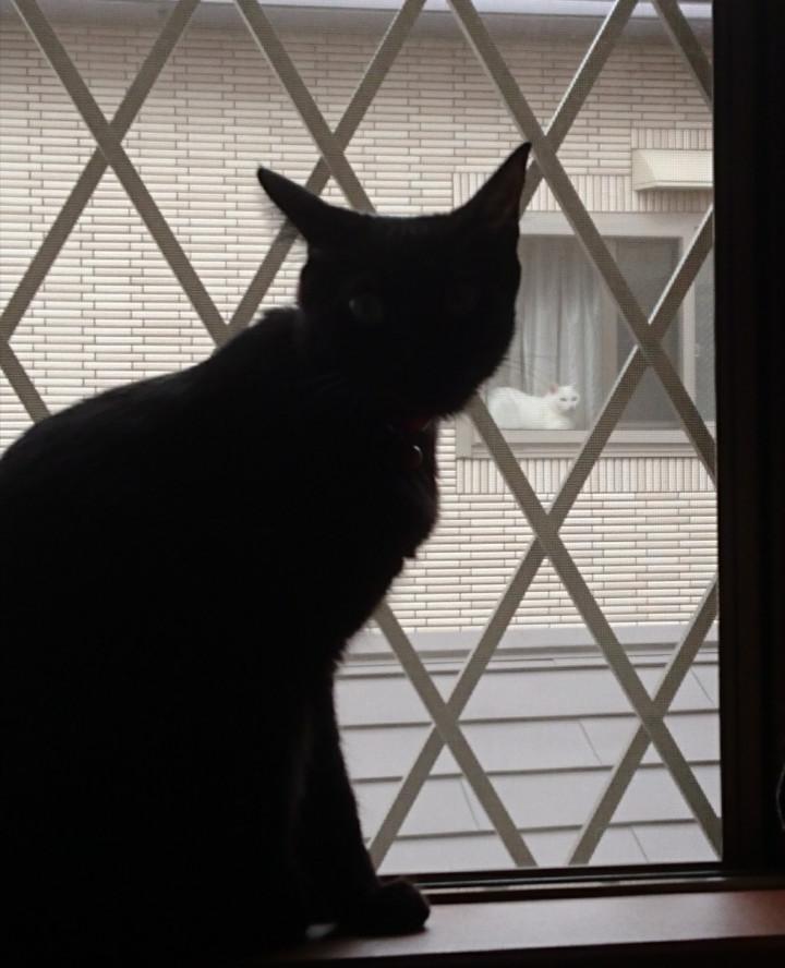今朝はタイミングよく出会えました。留守番してる時にこうして窓越しの逢瀬を楽しんでいるようです(*´ω`*)