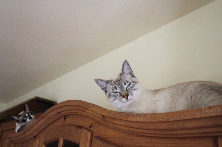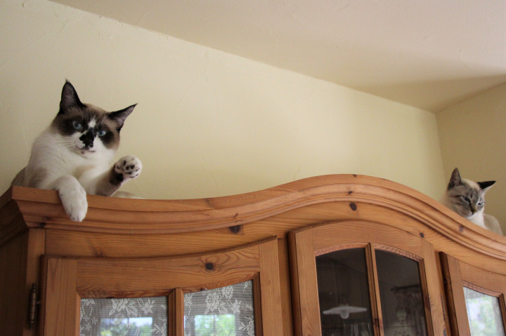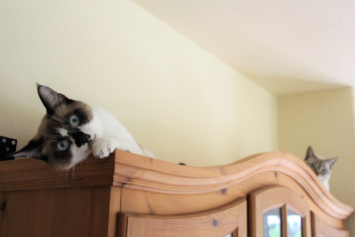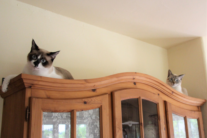 カップボードの 端と端にいるチー&モカ