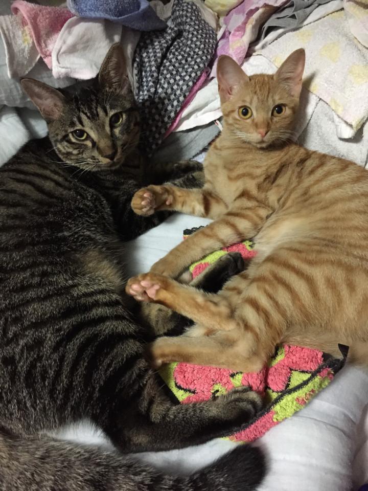 取り入れた洗濯物でくつろぐのが大好き仲良しコンビ