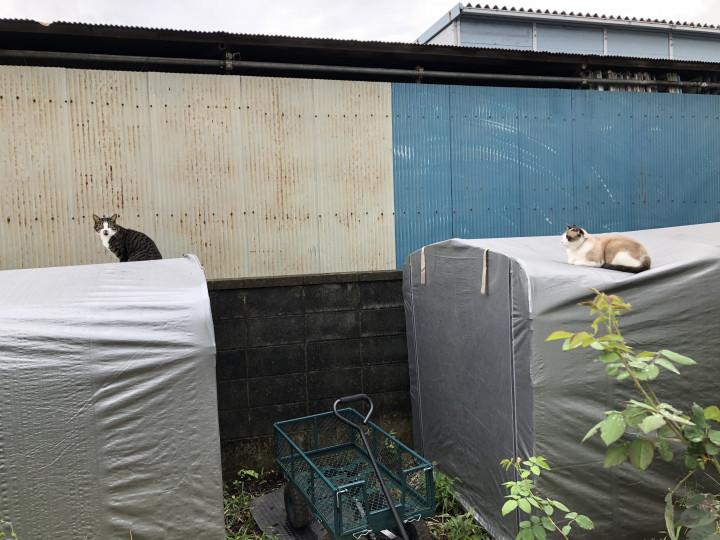 塀ぎわのビニール倉庫の屋根の上でくつろぐ白。