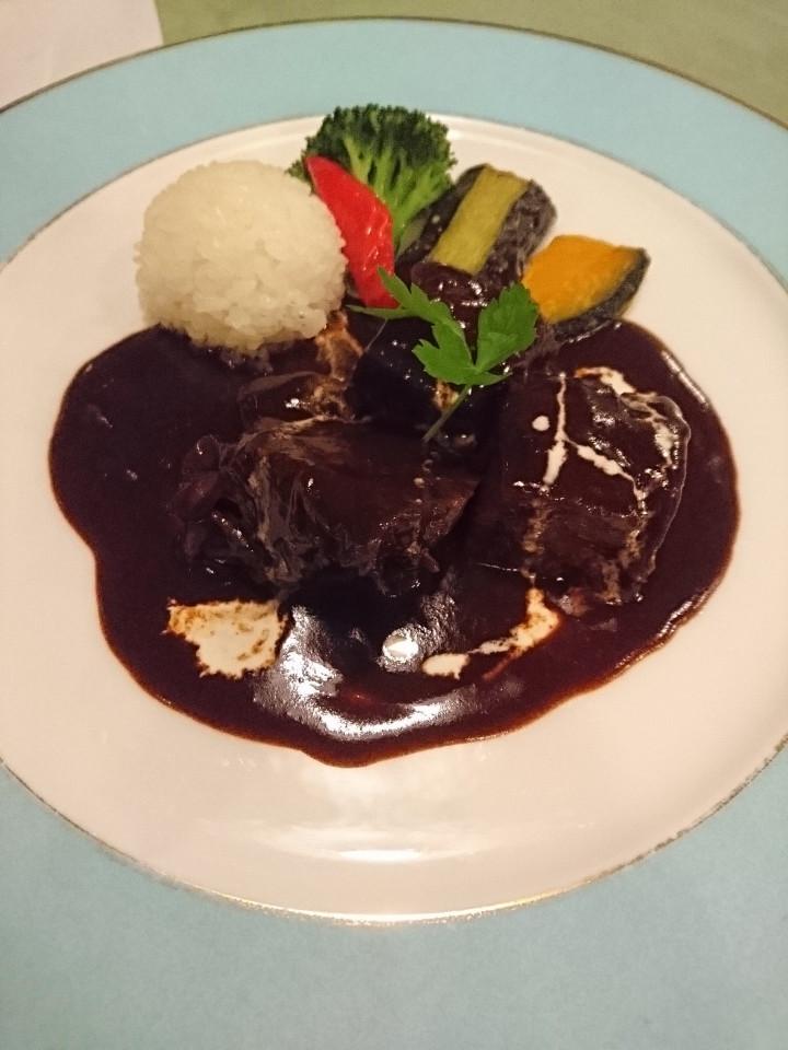 ディナーのメーンディッシュ、赤ワインで煮込んだ黒毛和牛