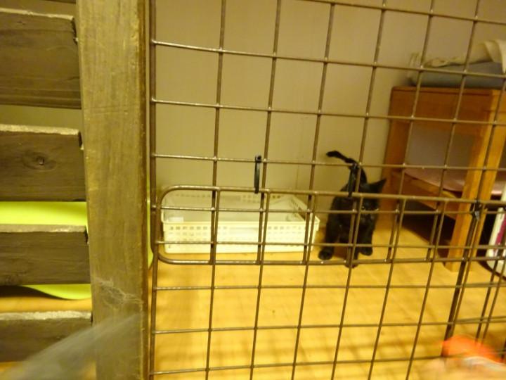 子猫の様子を見ていると、庭からみーちゃん親子にアピール、土間にいる猫にはルーバーフェンス越しに