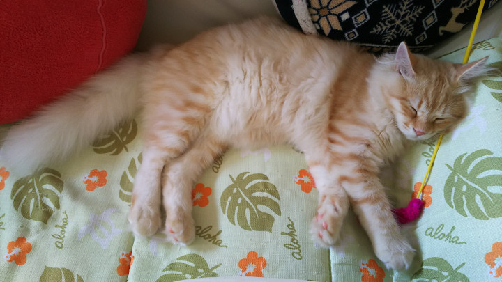 とっても大きくなって毛並みもフワフワもふもふになりました。元気いっぱい遊んで新聞紙の上で寝るのが好きです。寝顔に癒されています。