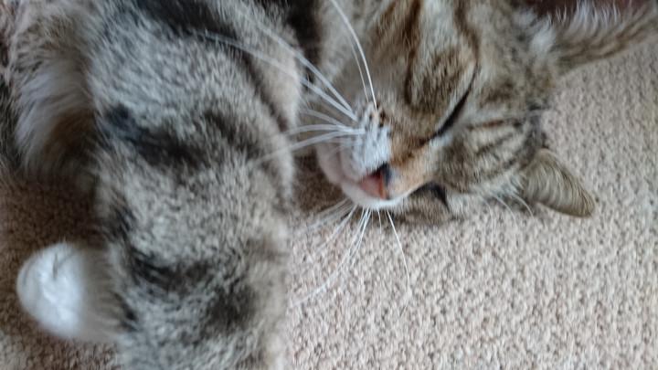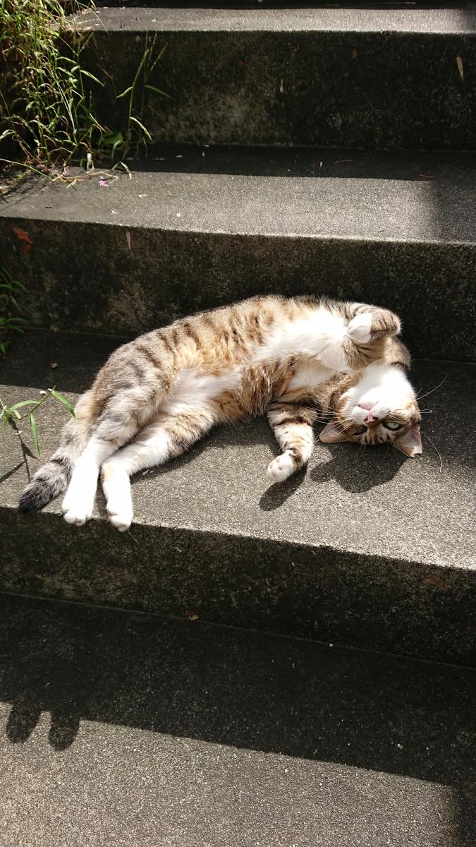 猫3号が2階のお洗濯物部屋に入り、ゴロゴロ寝転んでます。