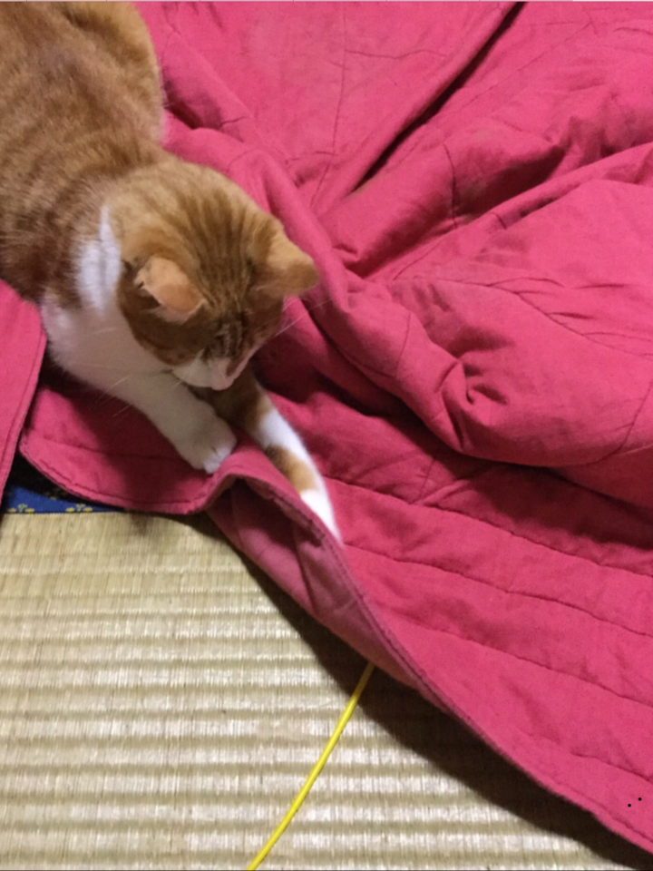 古いマルチカバーの下に、猫じゃらしの棒を入れて、カサカサ動かします。