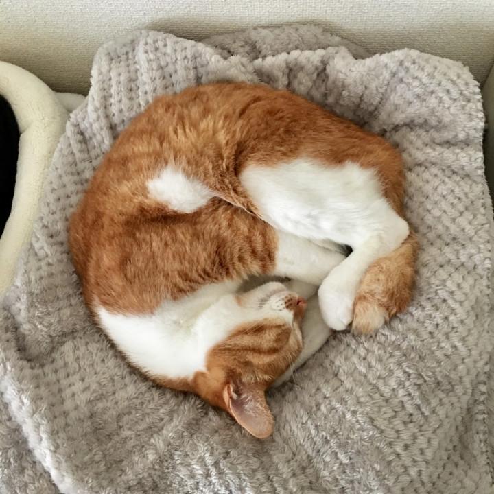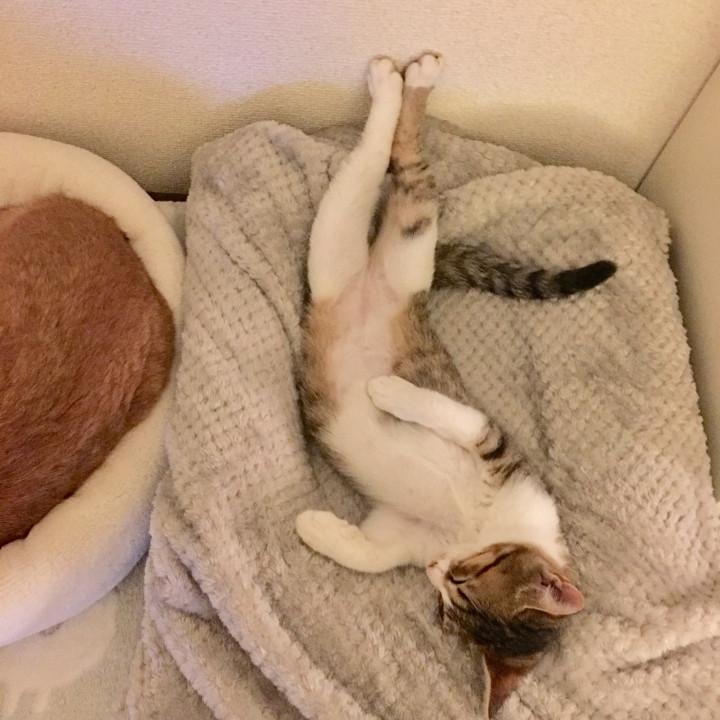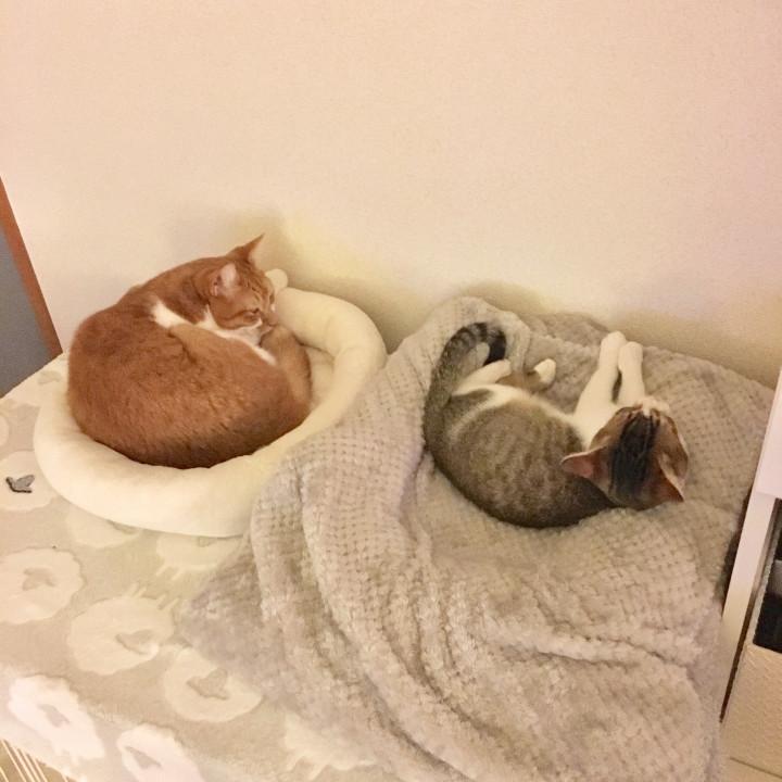 新入りすずが、お気に入りのベッドで、寝ていても、好きなだけ使っていいよ〜僕は隣で寝るからね、って感じ。優しいね、たーちゃん。すず、寝相悪いな〜(^^;;