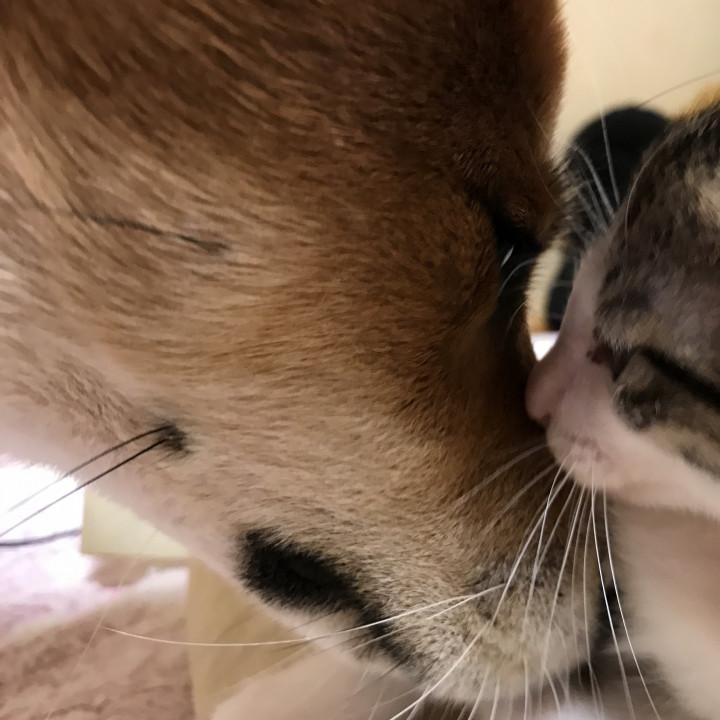 今日、仔猫のそら君が保護犬ひなたの鼻チュを受け入れた♫