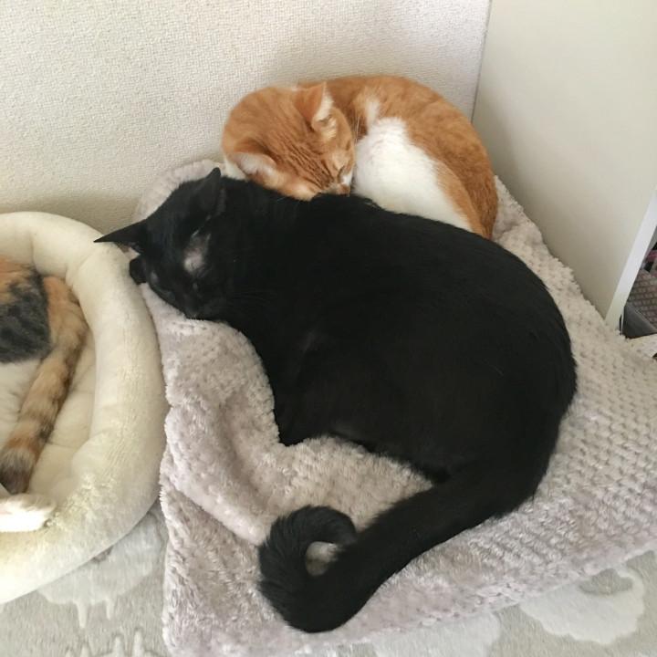カイは、好き嫌いなく、なんでも良く食べ、こんなに大きな立派な猫になった(^^;;塀の上で、叫んでいたあのチビとは思えないほど、たくましくなったけど、寂しがり屋。先住猫のたーちゃんの側に寝たい、どうしても(^^;;ちょっと、カイ、重たいでしょ(^^;;たーちゃんは、嫌がったりしない。だから、カイはたーちゃんに、会えて良かったね。カイの尻尾は、いつも、丸、になってるでしょ。なんか、不思議な尻尾。