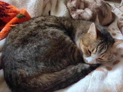 寂しがるといけないので、夜は、私が大人組、母が子猫を一緒に寝ています。