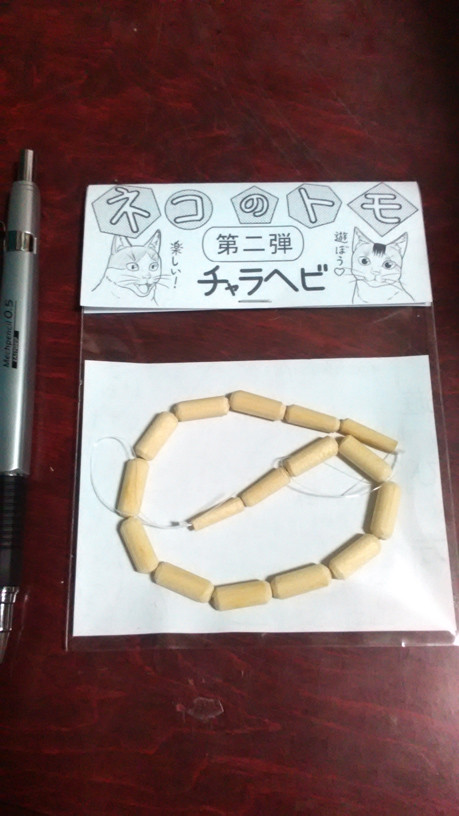 円柱型の木に穴を開けて、丈夫な糸で繋げました。チャラチャラ音が出ます。
