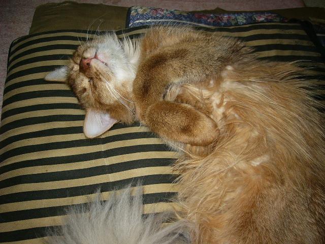 ネズミ狩りごっこで疲れて寝始めた時が、遊びで走り回って乱れた毛の手入れをするチャンスなので、