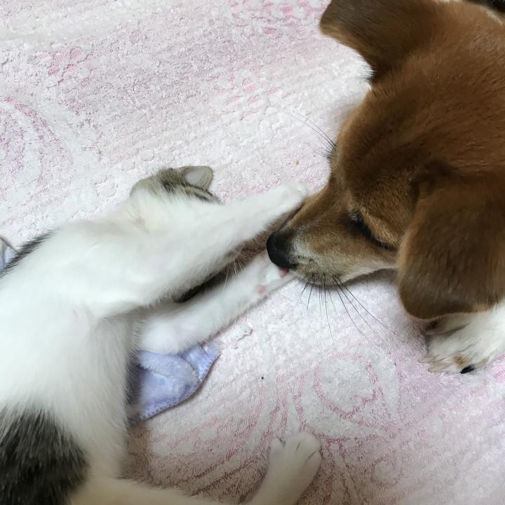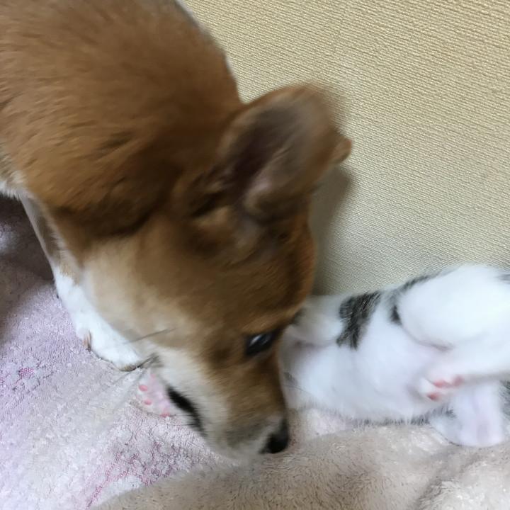 保護犬は、子猫から「猫パンチ」と「噛み噛み攻撃」の応酬。