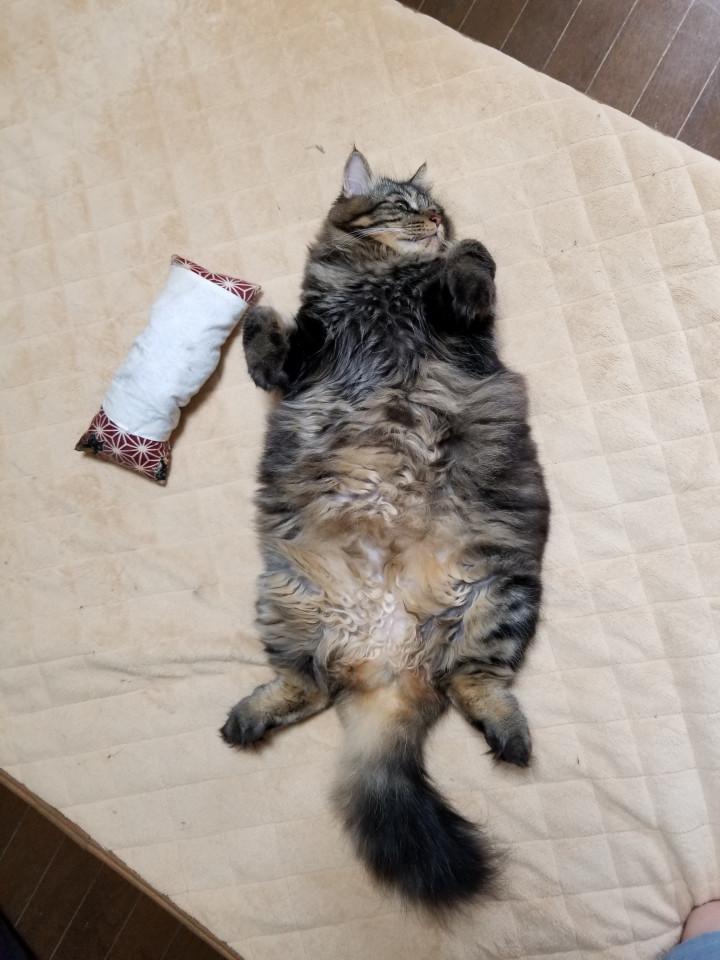 余談ですが日向ぼっこ中のきなこのこの写真を知り合いに送ったら、タヌキの置物みたい❗
