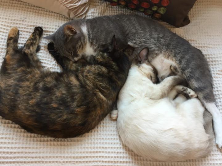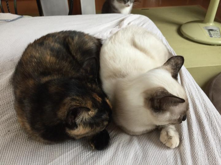 現在もうすぐ1歳になるエマちゃんと、トイプードルの老犬15歳二匹とも大人しく仲良しです。8月にハチとロクを迎えまして、朝方運動会を毎日しております。 エマちゃんが、猫語で、何やらニャ〜ニャ〜ウニャ...