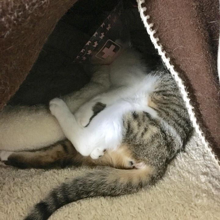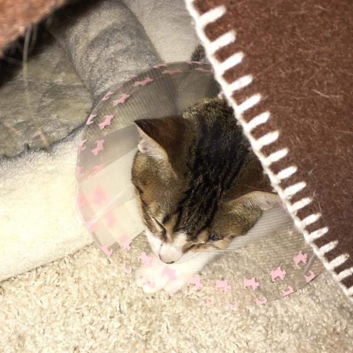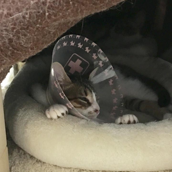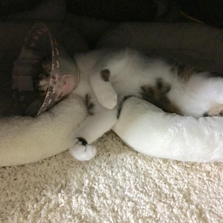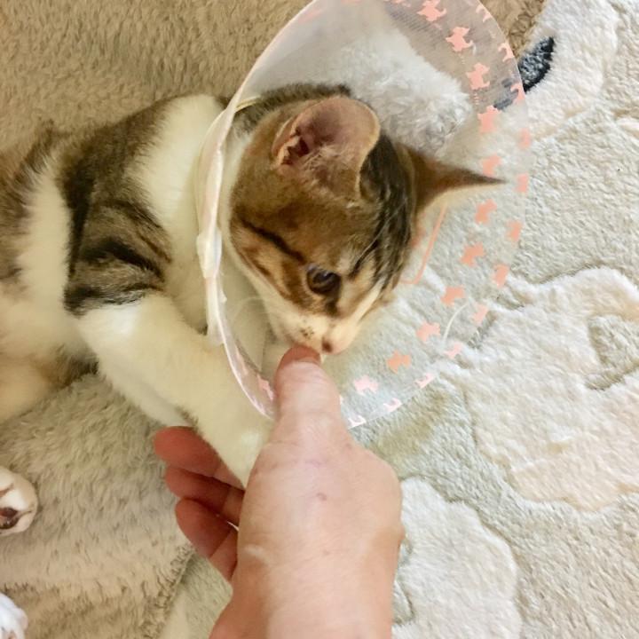 あったかいね、すず。ちょっと、カラーが邪魔だよね。すずの傷は、腫れる事なく、順調に回復に向かってるみたい。良かった。痛くないかな〜。猫の治癒力には、驚かされる。動物は、人間みたいに、軟弱じゃないね、すごいなぁ、私なんか、口内炎が出来ただけで、痛くて痛くて・・、ちょっと、違う?(^^;;