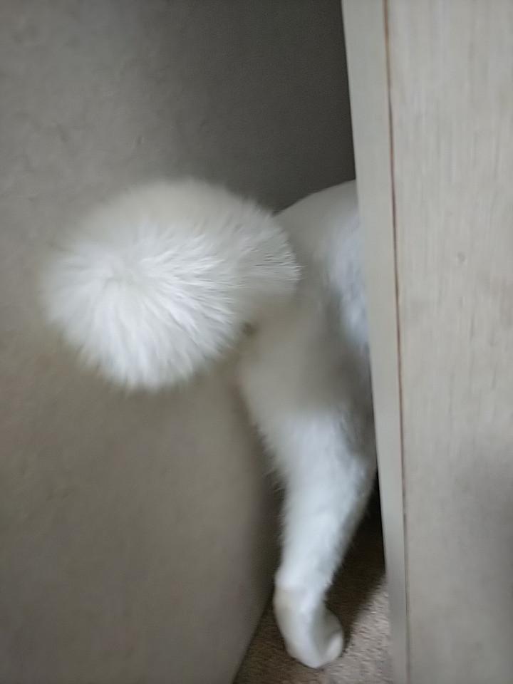 いっぱい遊んで、興奮して。尻尾がモフモフになっていました(=^ェ^=)。