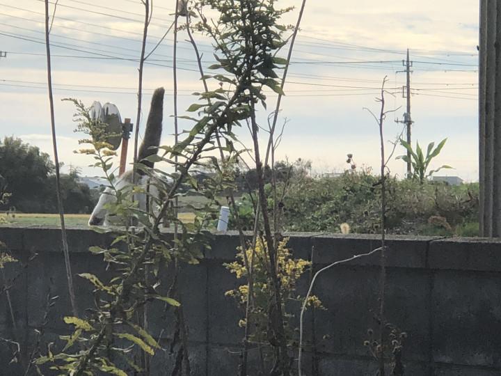 門を出て資材置き場を見る。白が畑の方へ歩いている。