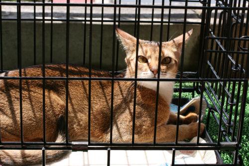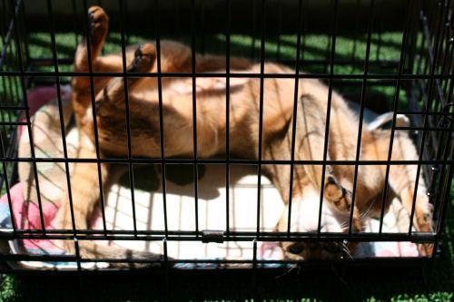簡易ケージにみ~ちょを入れてベランダで日向ぼっこです。