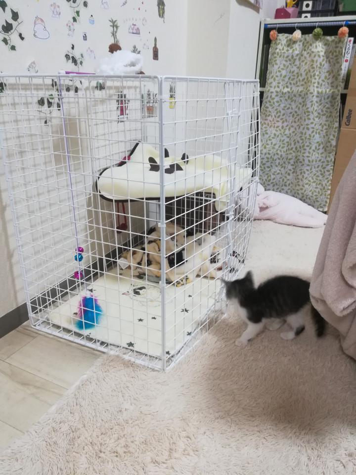 {2}DAISOの物たちで作りました🐱孫二人きて、孫娘も手伝いなんとか高いケージ買わなくてもとりあえず入ってくれました😭やれやれ、孫娘のすずちゃんの取り扱いはまさに人間の赤ちゃん並の可愛がり方で見てる方はストレスたまってんな‼️と(笑)可愛がって貰えると嬉しいですね🎵