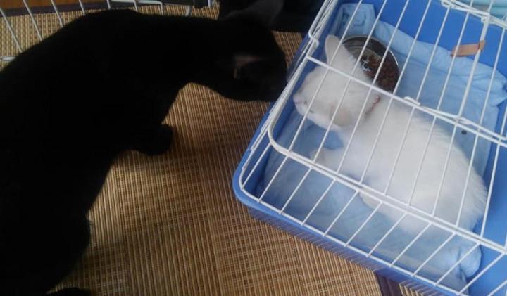 自宅に着いてケージに移るときにクロさんやミケさんが興味深々でやってきて…