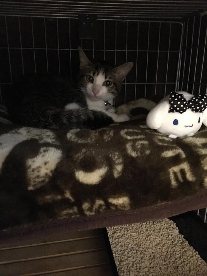 保護主さんはケージに毛布、トイレ用品、ごはんとおやつにオモチャまで用意してくださり、至れり尽くせり!