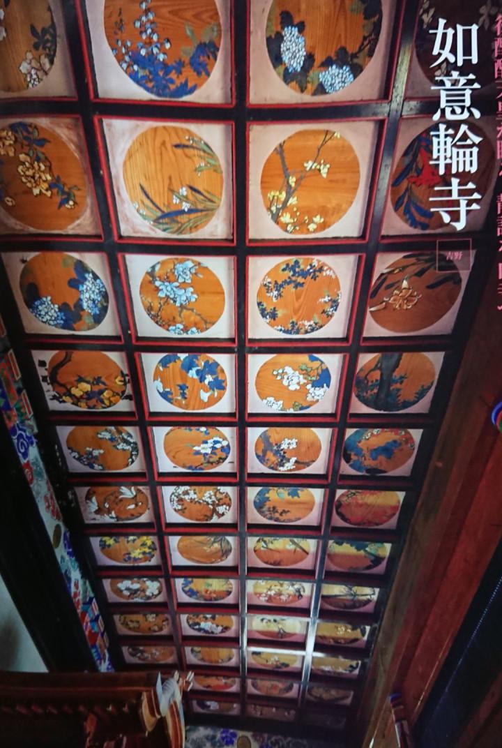 奥の木像が安直されている天井に54枚の花絵があります。