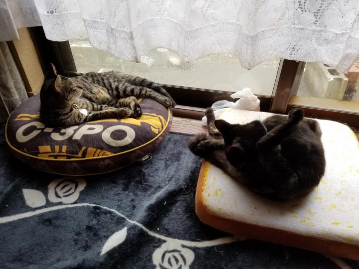 窓際で日向ぼっこしてるのは、ちび~ズ🐱