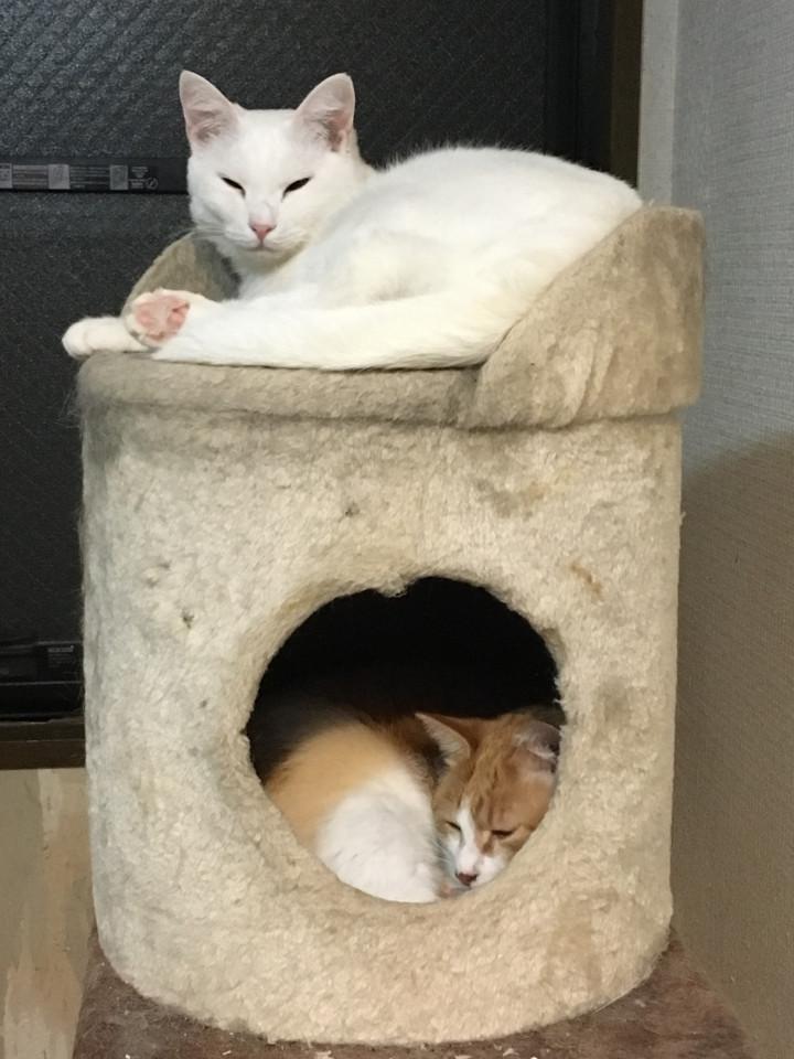 そして、寝る時も一緒のときが・・・・・(白猫が承太郎です。寝起き顔です。)