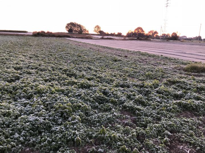 辺りが明るくなったので、霜が降りた畑の様子を一枚。